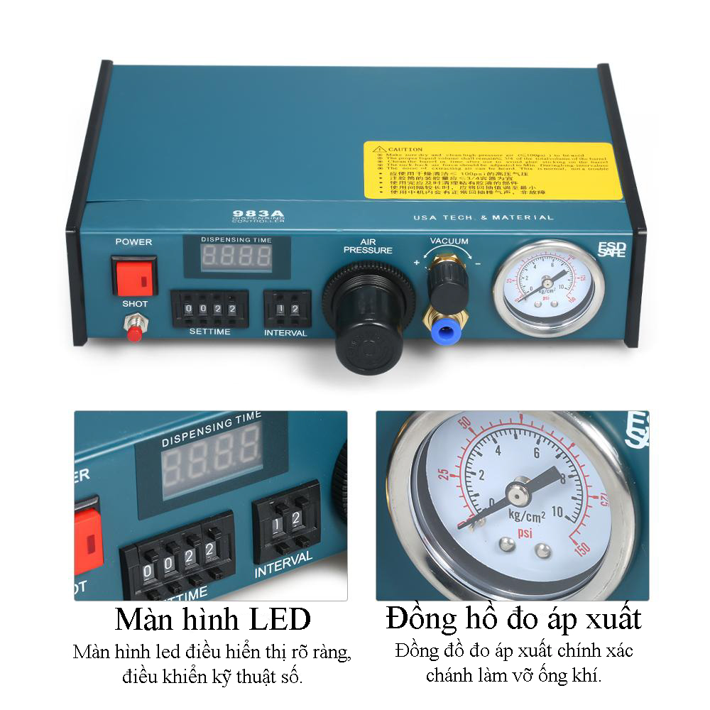 Máy nhỏ keo 983A có màn hình led, đồng hồ áp xuất, điều khiển kỹ thuật số.