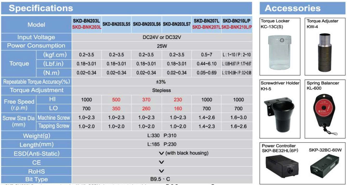 | SKD-BN210L | 1–10 kgf.cm | 0.10–0.98 N.m | 1000/700 rpm | 1.6–3.0 mm |